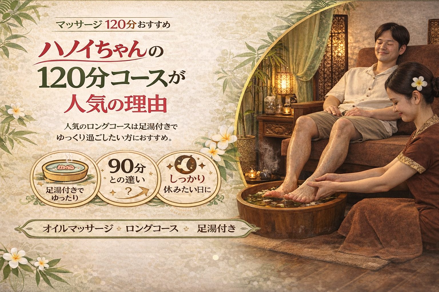 マッサージでしっかり休みたい方、足湯付きで落ち着いた時間を過ごしたい方、90分では少し物足りないと感じる方には、ハノイちゃんの120分コースがおすすめです。