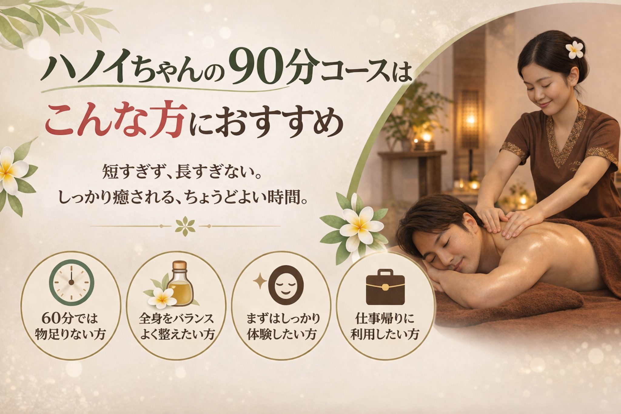 マッサージでしっかり整えたい方、60分では少し短いと感じる方、でも120分までは長すぎるかもしれないと感じる方には、ハノイちゃんの90分コースがおすすめです。