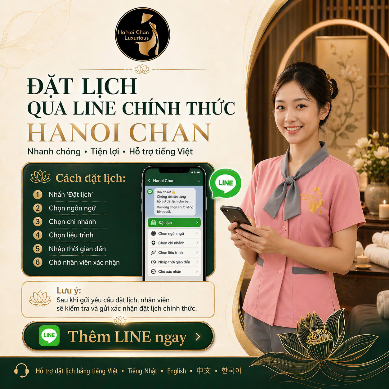 Xin lưu ý: Những đặt lịch qua LINE có thể không được xác nhận hoặc trả lời ngay lập tức. Vì vậy, để tránh bất tiện, chúng tôi khuyến khích bạn đặt lịch qua điện thoại.