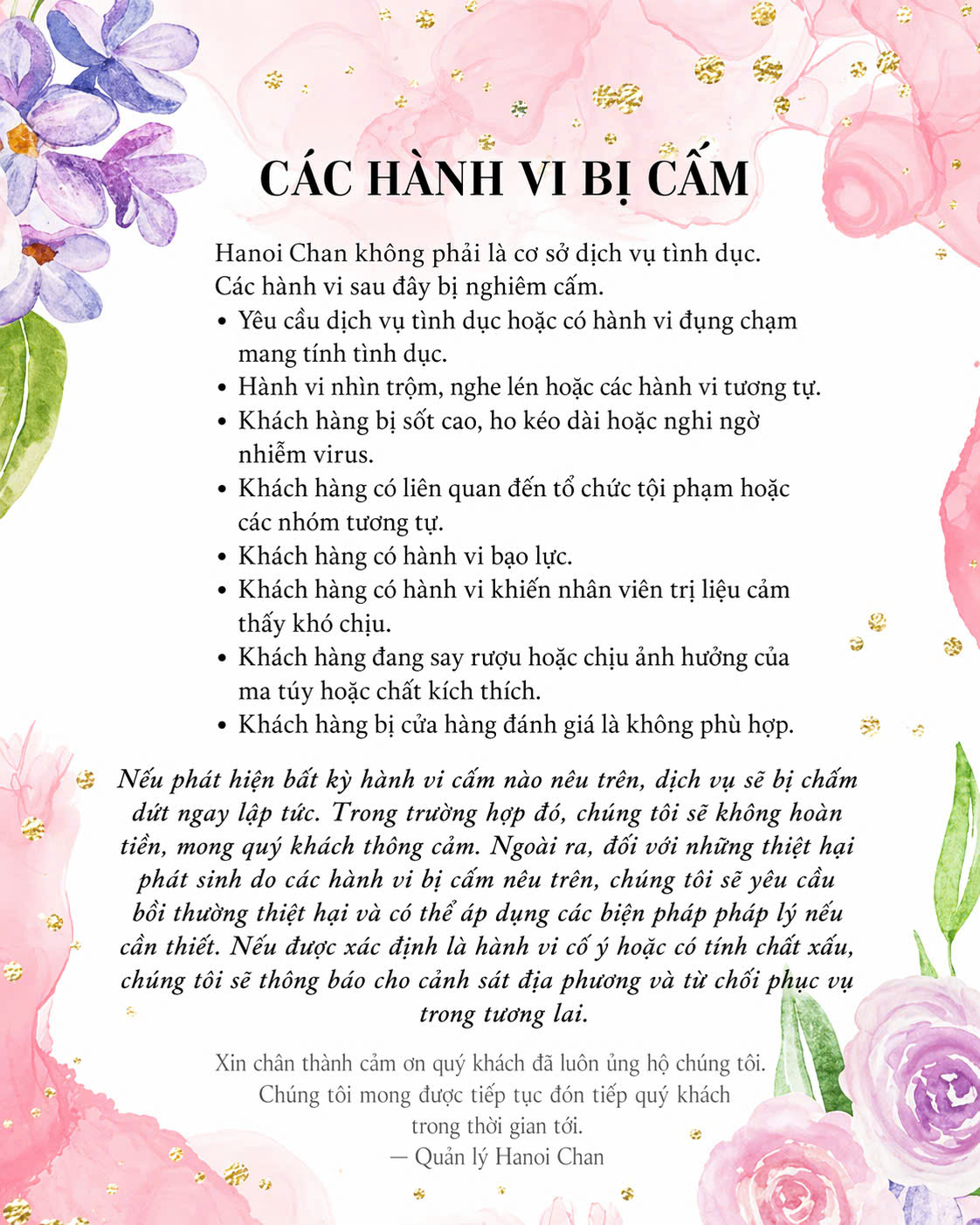 Chúng tôi nghiêm cấm những hành vi mà kỹ thuật viên không thích.