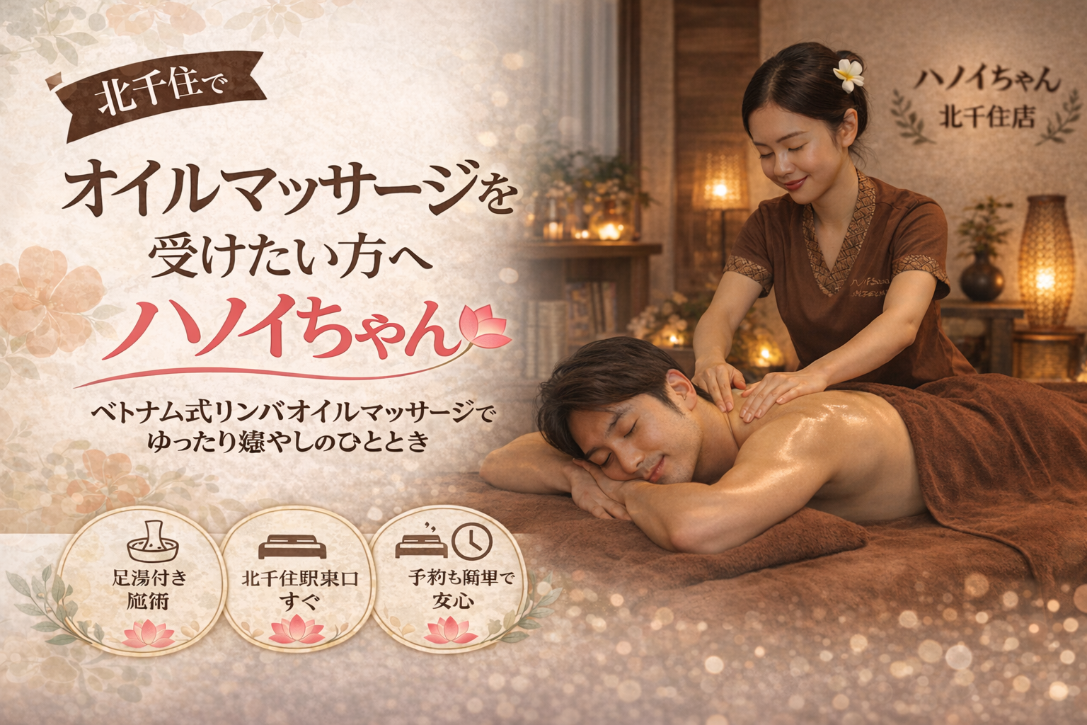 ハノイちゃん北千住店では、やさしい癒やしの時間と、ゆったり過ごしやすいベトナム式リンパオイルマッサージをご提供しています。この記事では、北千住でオイルマッサージを受けたい方へ向けて、ハノイちゃん北千住店の特徴や施術の流れ、ご予約方法とアクセスについて分かりやすくご紹介します。