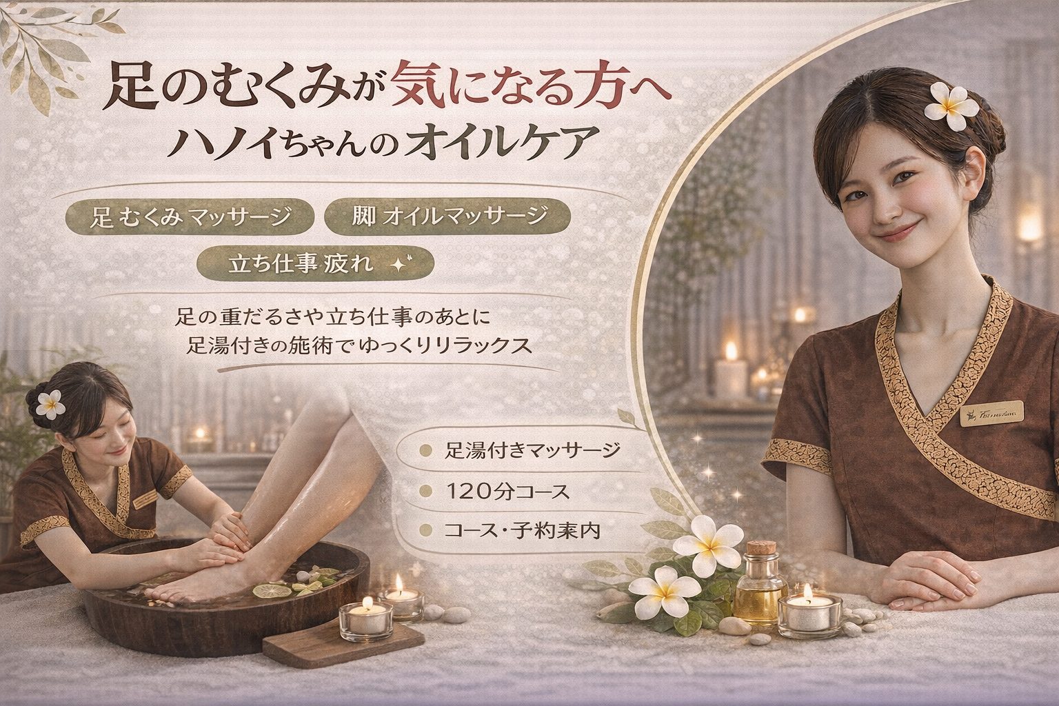 ハノイちゃんでは、ベトナム式オイルマッサージを中心に、やさしく落ち着いた癒やしの時間をご案内しています。足まわりの疲れが気になる日も、無理なく力を抜きながら、全身をゆっくり整えていけるのが特徴です。この記事では、足の重だるさが気になる方に向けて、足湯付き施術の魅力やおすすめコース、来店前に知っておきたいことをご紹介します。