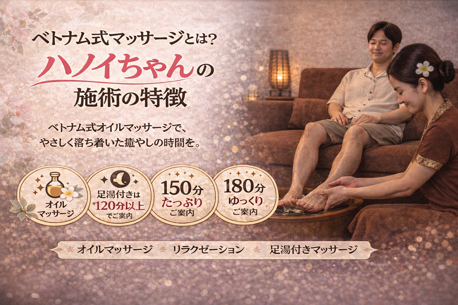 ハノイちゃんでは、ベトナム式オイルマッサージを中心に、やさしく落ち着いた癒やしの時間をご案内しています。強すぎる刺激ではなく、ゆったりと体を整えながら、気持ちまでほっとしやすい時間を大切にしているのが特徴です。この記事では、ベトナム式マッサージとは何か、施術の流れ、初めての方に知ってほしいポイント、おすすめコースについて分かりやすくご紹介します。