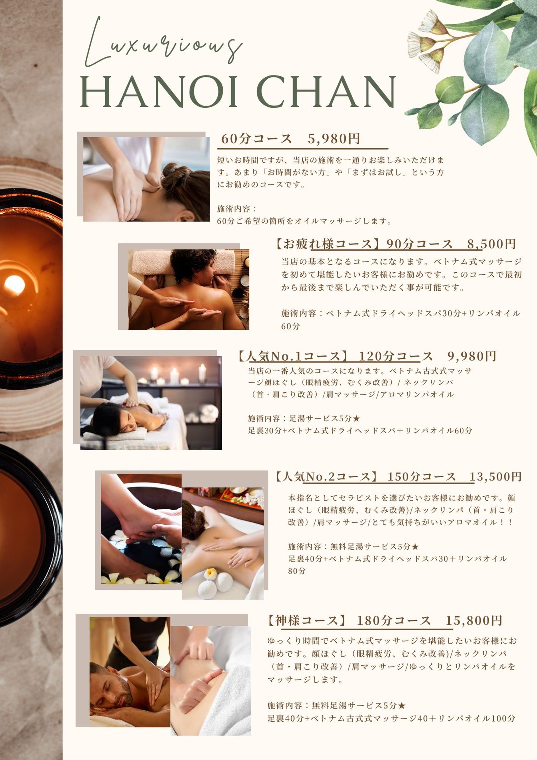 当店の基本となるコースになります。ベトナム式マッサージを初めて堪能したいお客様にお勧めです。このコースで最初から最後まで楽しんでいただく事が可能です。