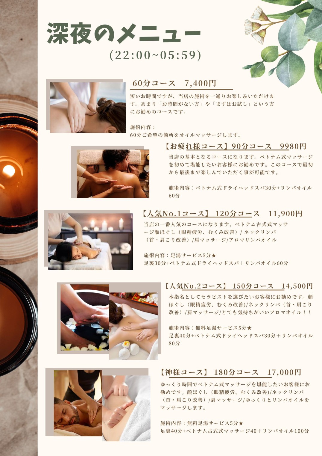 当店の一番人気のコースになります。ベトナム古式マッサージ顔ほぐし(眼精疲労、むくみ改善)/ ネックリンパ(首・肩こり改善)/肩マッサージ/アロマリンパオイル