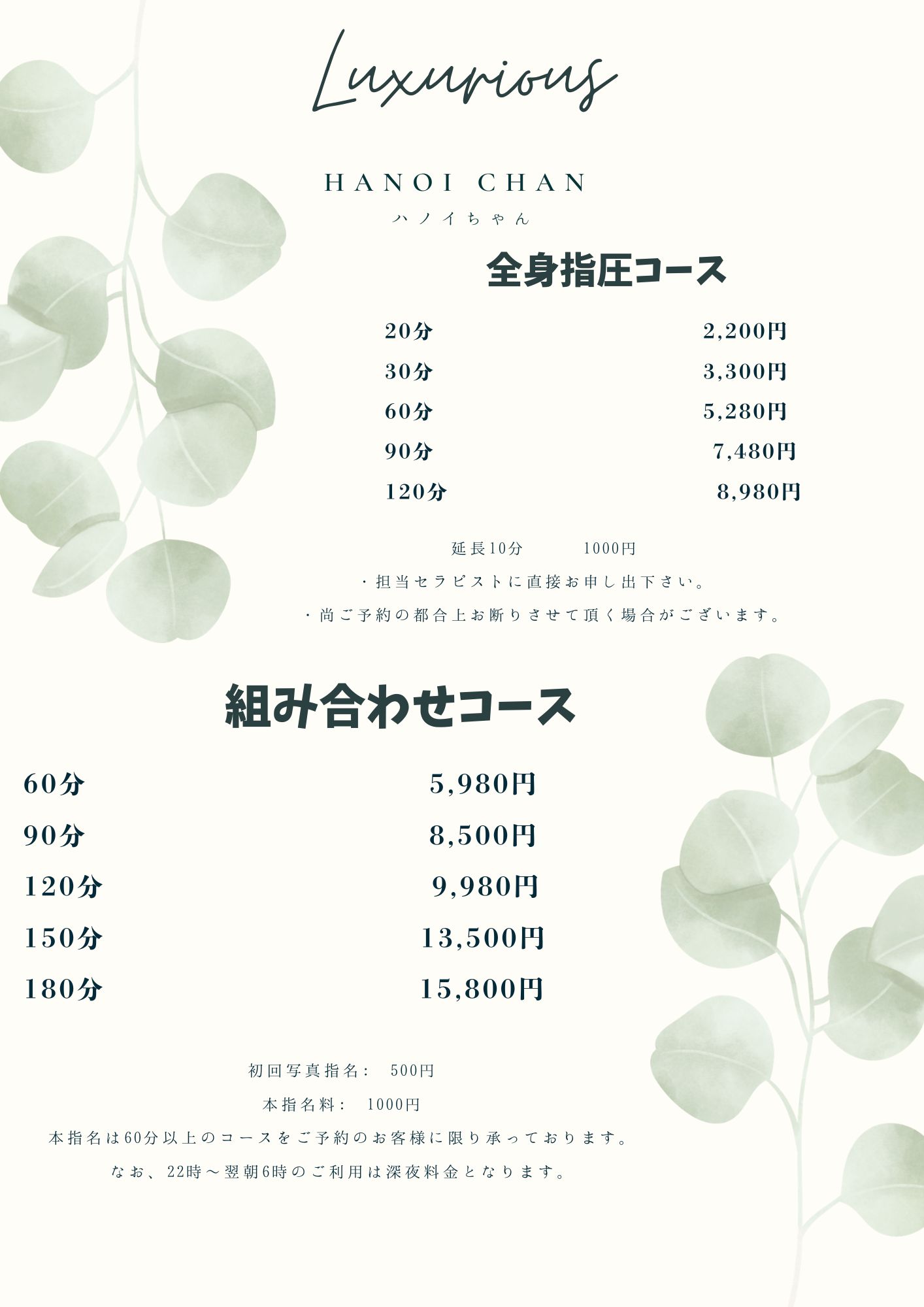 * 当店セラピストをご指名の場合、ご指名のセラピストの体調等の理由で欠勤や遅刻等をしてしまう場合がございます。その場合キャンセルもしくは自由にご案内となります事を予めご了承いただきますようお願い申し上げます。